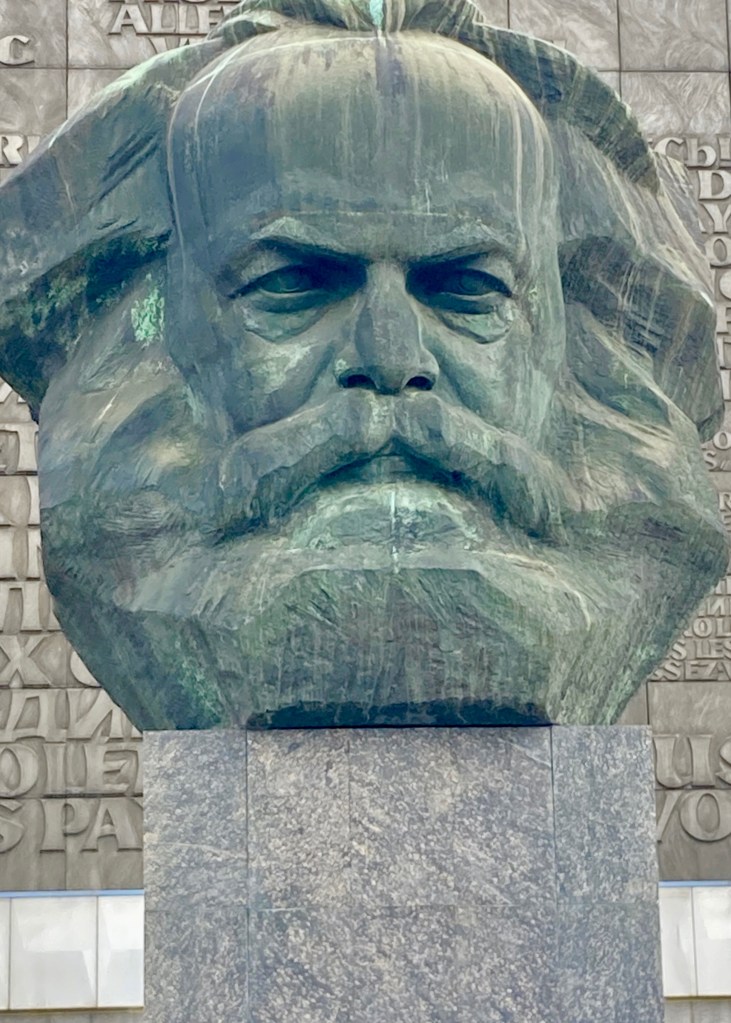 We started the third and final leg of our road trip in Dresden and drove to Leipzig via Chemnitz. We did not take the shortest road but decided to visit Chemnitz (formerly known as Karl Marx Stadt), only to see one thing: the Karl Marx monument: the so called “Nischl. The bust is huge, 13 meters high and it weighs approximately 40 tonnes. On the wall behind the monument it reads ” Workers of all countries unite” in four languages, Russian, German, French and English. It is the second largest bust in the world. Apparently some Russian town holds a bust of Lenin which is slightly larger.